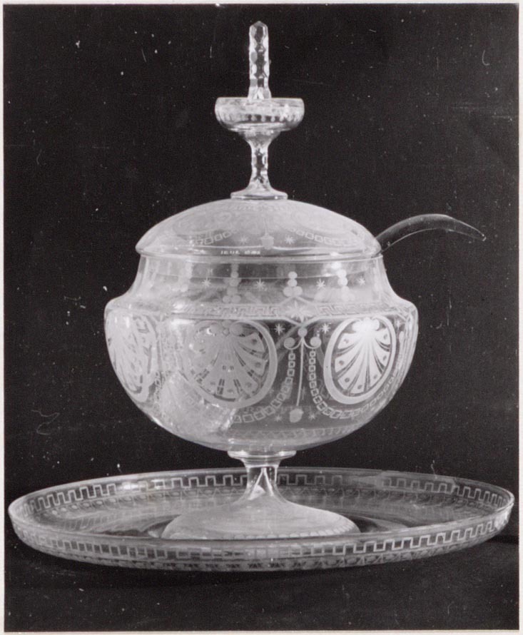 Helder kleurloos glas. Licht conische voet, overgaand in korte stam met schijf. Bolvormig lichaam, de bovenzijde ingesnoerd. Bolvormig deksel met tolvormige, deels gefacetteerde knop. Rondom lichaam en op deksel medaillons, guirlandes, meander- en gestileerde bladmotieven. Op dekselrand het ingekraste cijfer: 3./.