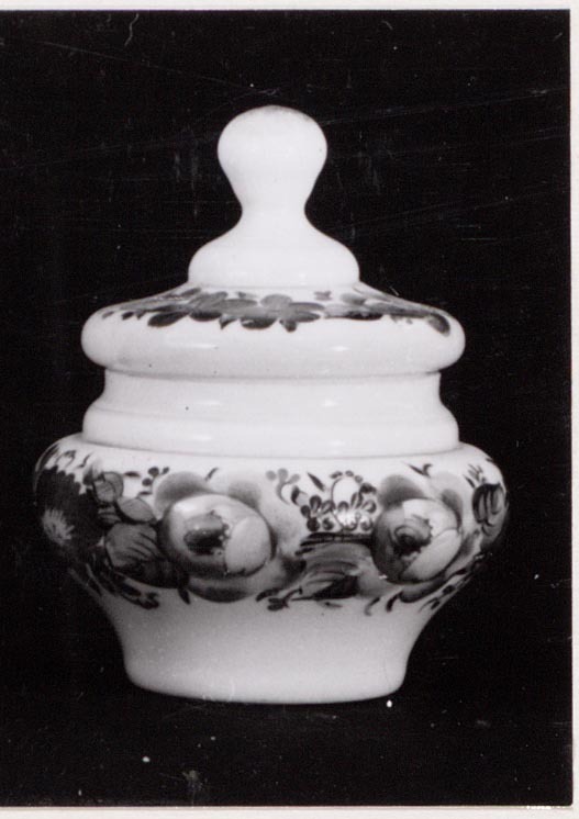 Melkglas. Vlakke bodem. Afgeplat bolvormig lichaam, de bovenzijde licht ingesnoerd. Geweld deksel met bolvormige knop. Rondom lichaam en deksel blad- en bloemmotieven. Resten verguldsel op lichaam en deksel.- Trefwoorden