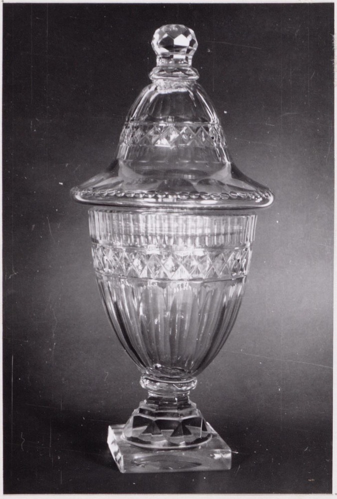 Helder kleurloos, lichtgrijs getint glas. Vierkante, verdikte voet. Conische stam met knoop. Eivormige kelk. Klokvormig deksel met bolvormige knop. Stam, kelk, deksel en knop in facetten, olijven, ruiten en diamanten geslepen.- Trefwoorden
