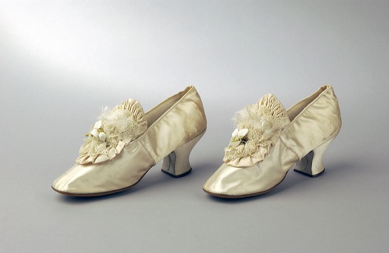 Paar crèmekleurige zijden satijnen open huwelijkschoenen met leren zool, gevoerd met glacé-leder. Op de neus rozet van kant met oranjebloesem en uitgerafeld lint.