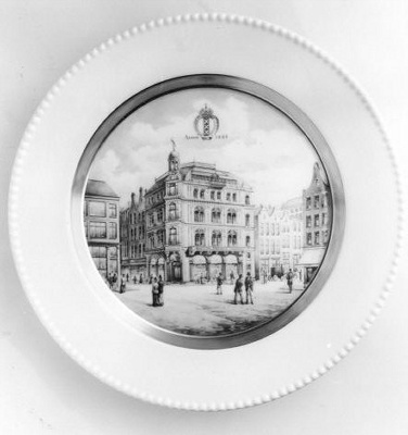 Herdenkingsbord. Voorstelling: het door Berlage in 1885 gebouwde pand op de hoek van de Kalverstraat en het Spui naar een aquarel van H.P. Berlage.