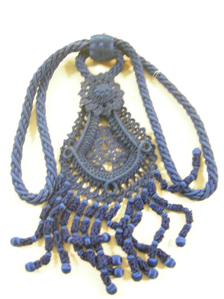 Donkerblauw gordijnkoord, 'druppelvormig' met aan de onderkant franjes.- Trefwoorden