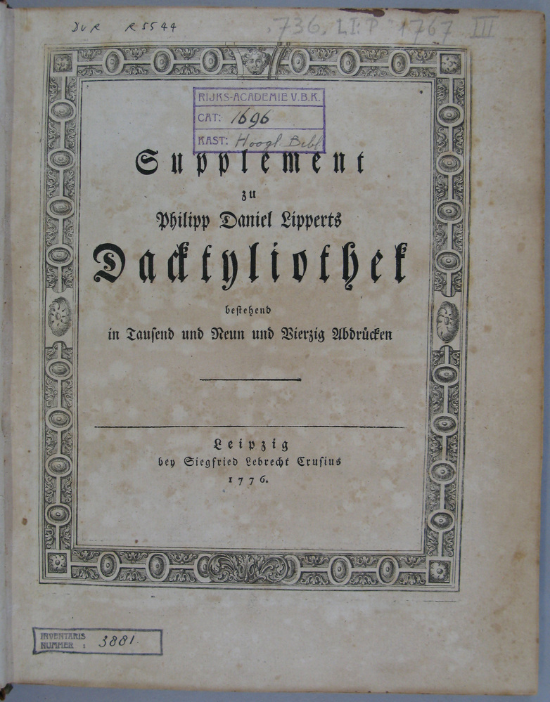 - Dactyliothec : das ist Sammlung geschnittener Steine der alten aus denen vornehmsten Museis in Europa zum nützen der schönen Kunste und Künstler. Supplement zu Philippe Daniels Lipperts Dactyliothec bestehend aus Tausend und Neun und Vierzig Abdrücken