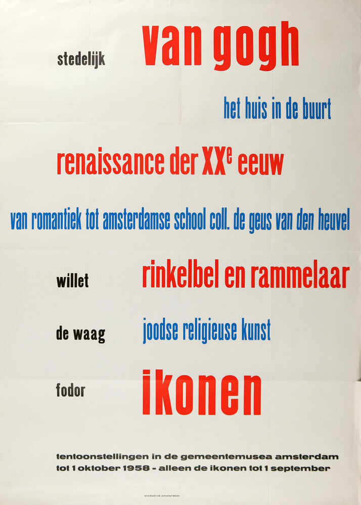 - Affiche voor tentoonstellingen in de gemeentemusea Amsterdam tot 1 oktober 1958, o.a. 'Rinkelbel en rammelaar' in Museum Willet-Holthuysen, 1958