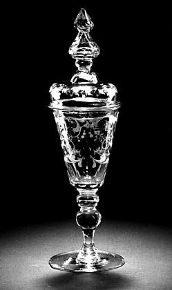 Helder kleurloos glas. Platte voet. Balusterstam met knoop en drie schijven. Conische kelk met afgeronde basis. Dubbel gewelfd deksel met samengestelde knop. Rondom kelk en deksel bloem en bladranken. Stam, kelk en dekselknop in olijven geslepen.- Trefwoorden