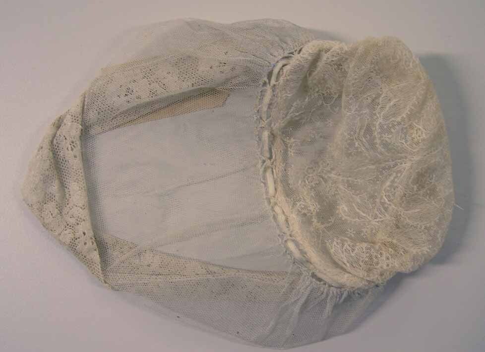 Sluierkap van witte tule met geplooide voorrand. De bol is geborduurd, kant langs de onderrand.