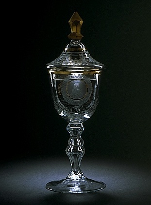 Helder kleurloos glas. Conische voet. Basisknoop. Holle balusterstam met twee knopen en langgerekte luchtbel. Eivormige kelk, in facetten geslepen. Op kelk een door stralenkransen omgeven medaillon waarin het portret van een heer in burgemeesterstenue met staatsiepruik en het opschrift: HENRIK HOOFT Danielsz. BURGEMEESTER der Stadt AMSTERDAM./. Onder medaillon een keeshond en het opschrift: Zie hier het Beeld des acht'bre Hooft!/ Wiens Heilzon nimmermeer verdoofd,/ Wiens Grootheid nu, nog, nooit zal sneeven/ Zolang den Patriot zal leeven/. Op andere zijde het gekroonde stadswapen van Amsterdam, gehouden door twee leeuwen. Hierboven het opschrift: HET WAAPEN VAN AMSTERDAM./. Onder wapen de datering: 1789./ en het opschrift: Het Acht'bre Wapen van de Groote Stad aan 't Y/ Het Kweekschool van de Vrijheidminnende Burg'ry/ Sal Eeuwig 't Gryze Hoofd van Vader Hooft bekronen,/ Lang Leev' Deez' Braave Held, en alle Vrijheids Zonen/.