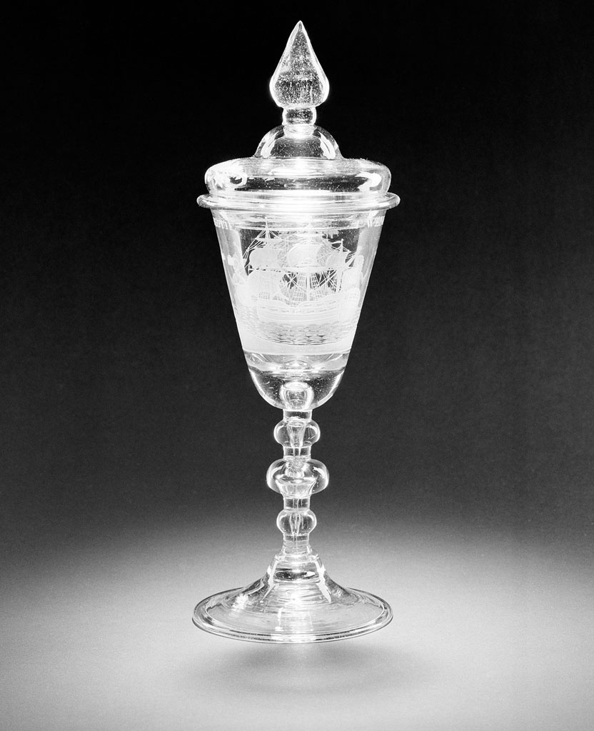 Helder kleurloos glas. Conische voet met omgeslagen rand. Stam met drie knopen en langgerekte luchtbel. Op kelk een zeilende driemaster met vlag waarop de letters: VOC/ en een boom met links Neptunus met drietand, schelp en watervat en rechts Mercurius met staf. Hierboven het opschrift: .T. WELVAAREN. VAN. DE. GOEDE. NEGOTIE./. Gewelfd deksel met puntige knop. Op deksel twee gekruiste bladranken. Gepolijste details.
