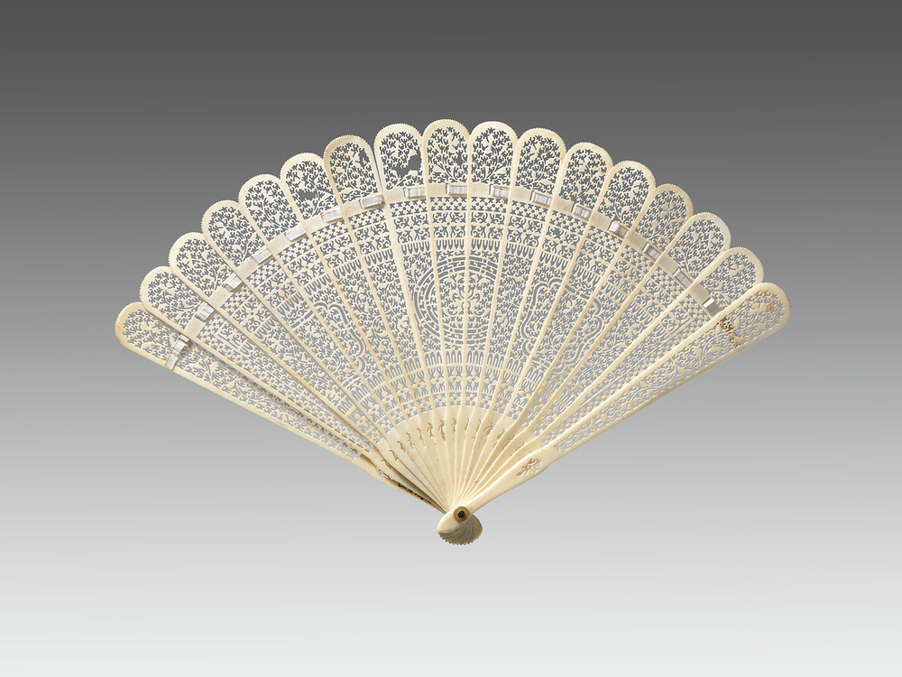 Brisé-waaier met ajour bewerkte benen en metalen sluitpin. Lint door bovenzijde.- Trefwoorden