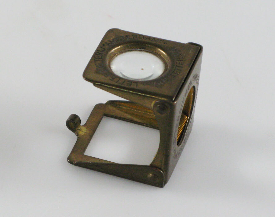Inklapbaar vergrootglas, met ingegraveerd rondschrift LETTERGIETERIJ "AMSTERDAM"/ v/h N. TETTERODE.- Trefwoorden
