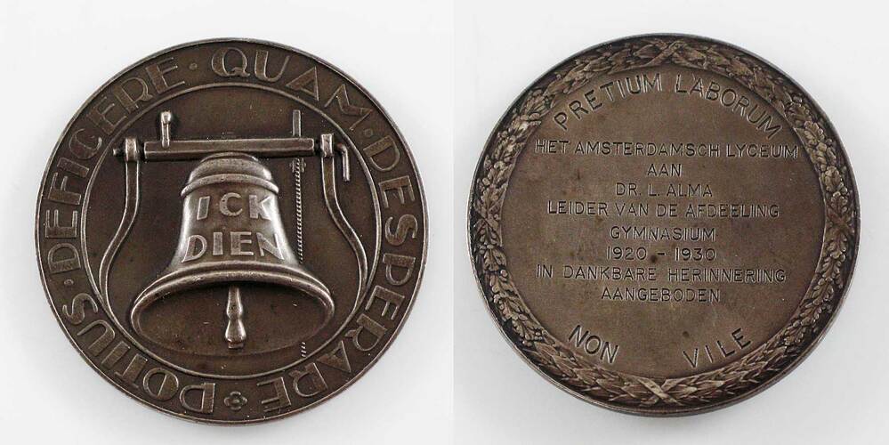 opschrift keerzijde: HET AMSTERDAMSCH LYCEUM / AAN / DR. L. AKMA / LEIDER VAN DE AFDEELING / GYMNASIUM / 1920-1930 / IN DANKBARE HERINNERING / AANGEBODEN