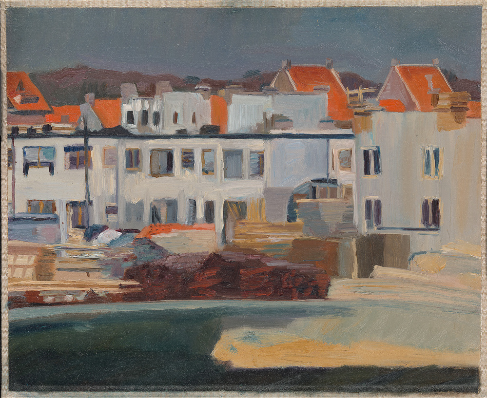 Het is een zonnige dag als Nicolaas Pieneman de bouw van nieuwe woningen in Amsterdam-Oost op doek vastlegt. De witte betonnen wanden weerkaatsen het zonlicht en geven de voorstelling een mediterraan karakter. Achter de lichtgekleurde, geometrische huizen verrijzen traditionele oranje pannen daken. Zo maakt Pieneman de scheiding zichtbaar tussen de twee helften van tuindorp Watergraafsmeer, de ene uitgevoerd in beton en de andere in baksteen. ( Anneke van de Kieft)