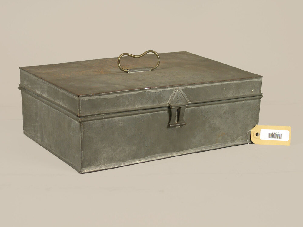 Blikken kist (1) met inhoud: 2) ingelijste ingekleurde tekening voorstellende Haesje Claes in het Paradijs, stichteresse van het Burgerweeshuis te Amsterdam Anno 1520. Stempel (brandmerk) achterzijde T. ZANDLEVEN. 3) ingelijste foto door Greiner van een huis met renaissancegevel. Op het glas een vrijwel onleesbare tekst die mogelijk de verklaring bevatte van het ingelijste. 4) Twee bonnenboekjes van de 'Inrigting voor Stads Bestedelingen' uit de jaren 1920/30 met bonnen voor een ‘halve flesch levertraan’.