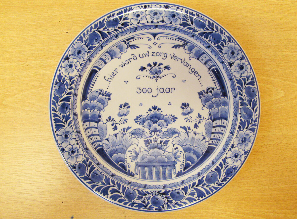 Gedenkbord van Delfts blauw, opschrift ‘Hier word uw zorg vervangen... 300 jaar’. Achterzijde merkteken De Porceleyne Fles, alsmede het opschrift ‘Het R.C. Maagdenhuis’ en enkele fabrieksmerken.- Trefwoorden