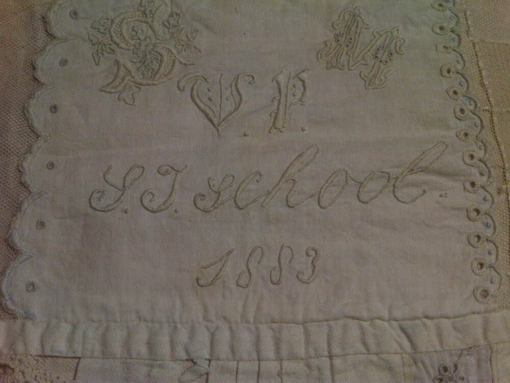 Handwerkstuk met kant -en weeftechnieken, brei- en haaktechnieken, borduursels en minikledingstukjes en diverse opengewerkte banden. Linksboven is met sierletters geborduurd een S en rechtsboven een M. Daaronder de letters S M en de letters V.P. Eronder zijn de letters S.I. School en het jaartal van vervaardiging 1883 in rood geborduurd.