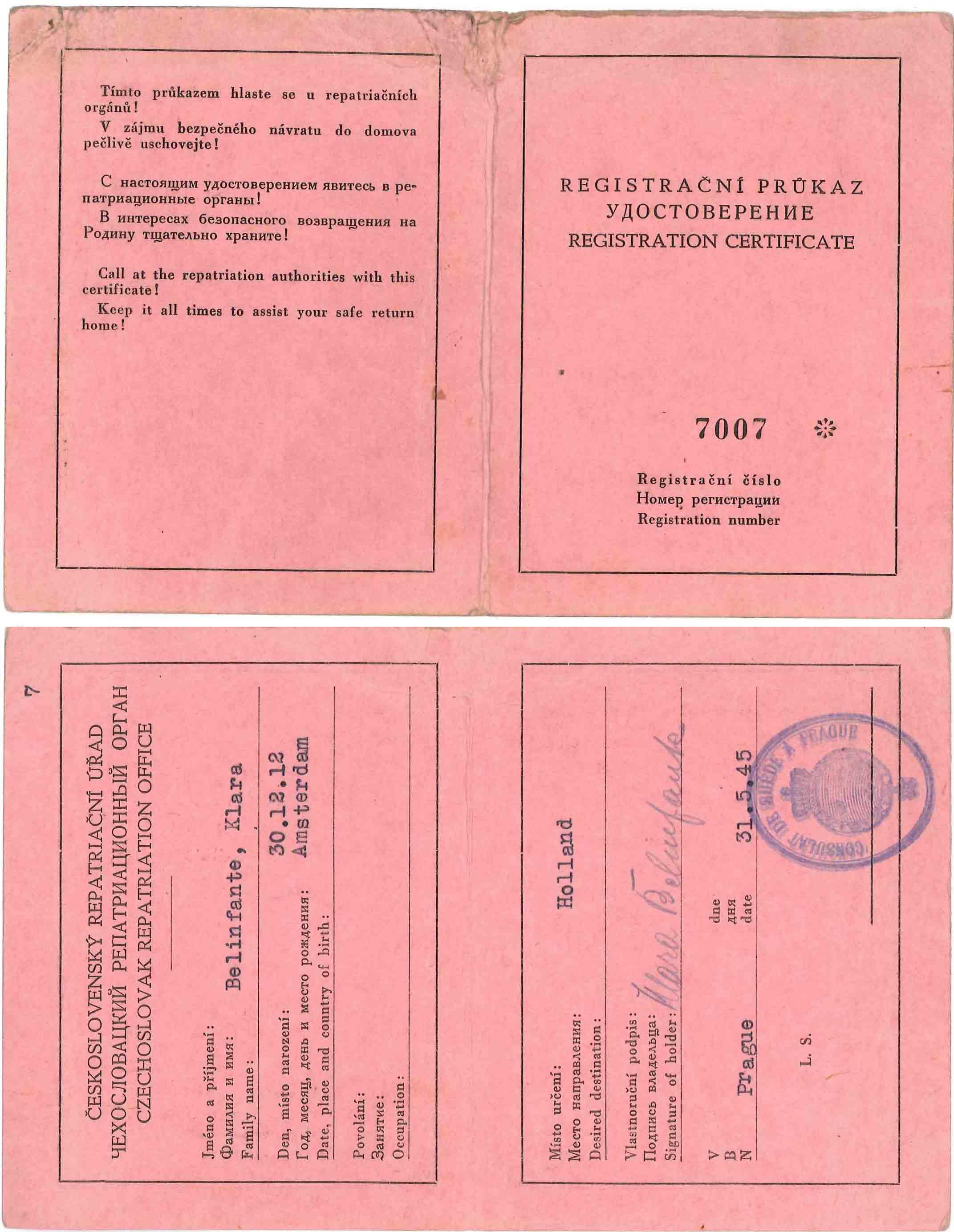 - Registratiebewijs voor repatriëring van Klara Günther (op naam van Klara Belinfante), 1945