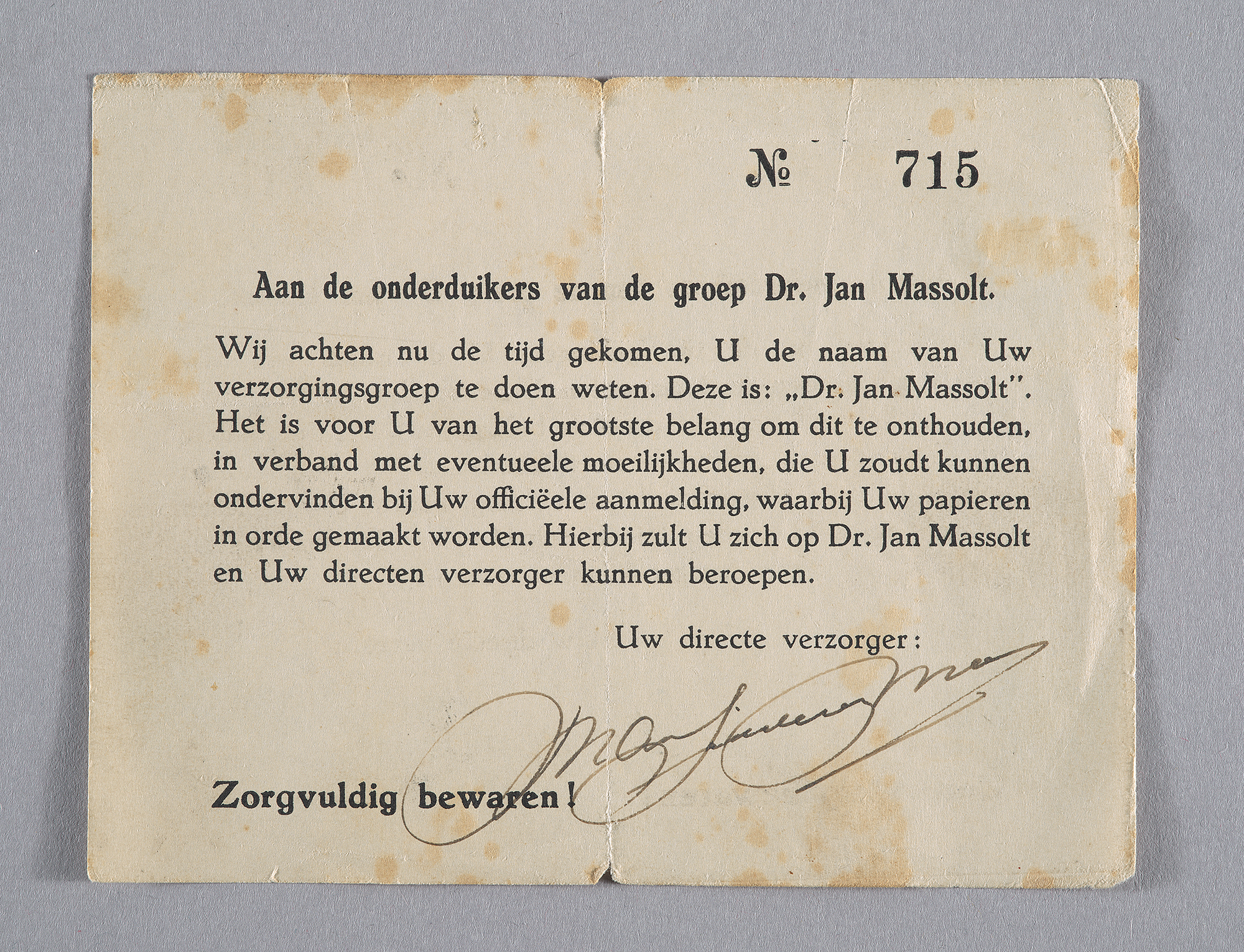 - Bericht aan de onderduikers van de groep Dr. Jan Massolt, 1941 - 1944