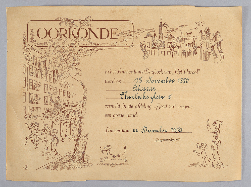 - Oorkonde voor club Alcazar, voor vermelding in het Amsterdams Dagboek van Het Parool op 15 november 1950, in de afdeling 'Goed zo' wegens een goede daad, 1950