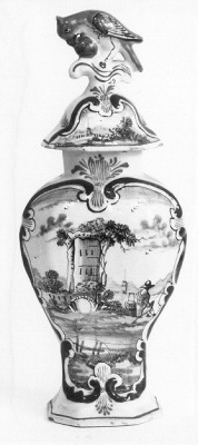 landschap met toren; pikkende papegaai als dekselknop- Trefwoorden
