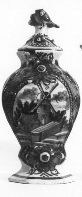 molen omlijst door bloemen. Duif als dekselknop- Trefwoorden