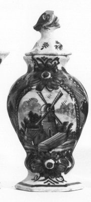 molen omlijst door bloemen. Duif als dekselknop- Trefwoorden