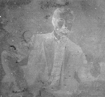 Cliché op houten blok. Voorstelling: een halve figuur aan tafel zittend, mansportret- Trefwoorden