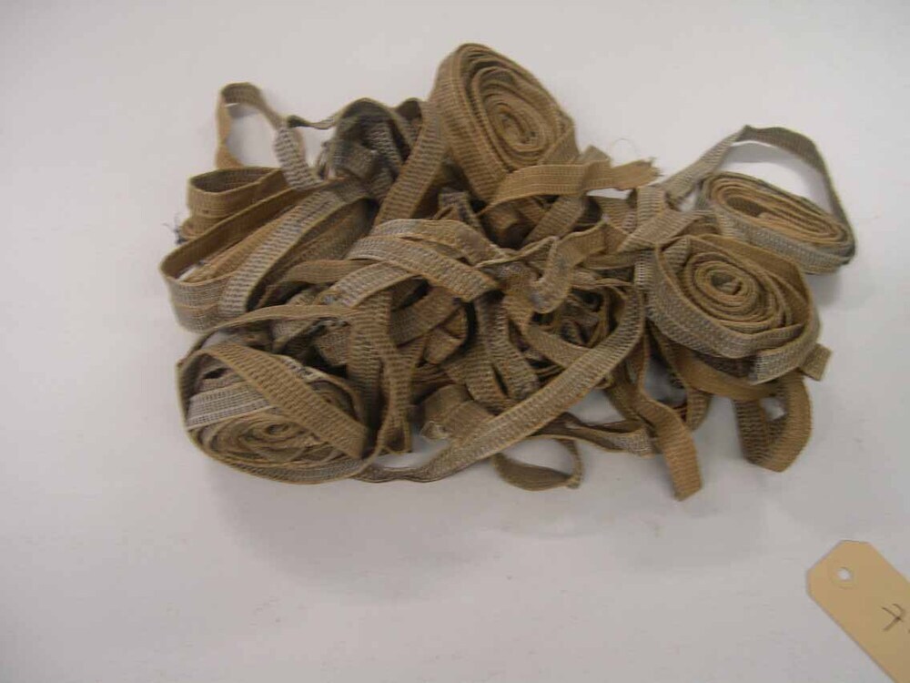 Passement, ecru en blauw, 15 losse stukken. In sommige stukken zitten spijkertjes, waarschijnlijk als afwerking van de wandbekleding.- Trefwoorden