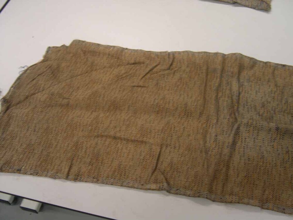 Stuk beige wandbekleding met goudbruin patroon. Wandbekleding rechts onder deur.- Trefwoorden