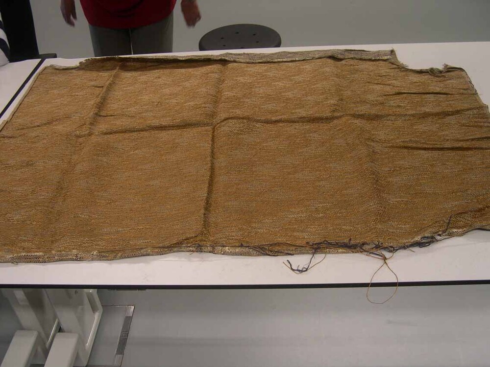 Stuk beige wandbekleding met goudbruin patroon. Wandbekleding rechts boven.- Trefwoorden