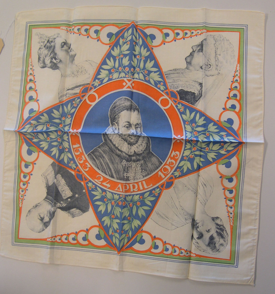 Witte zakdoek, herdenking 1533 24 april 1933. Witte zakdoek bedrukt met vijf portretten ( Willem van Oranje, Prins Hendrik, Wilhelmina, Emma en Juliana) in de kleuren oranje, groen en blauw.- Trefwoorden