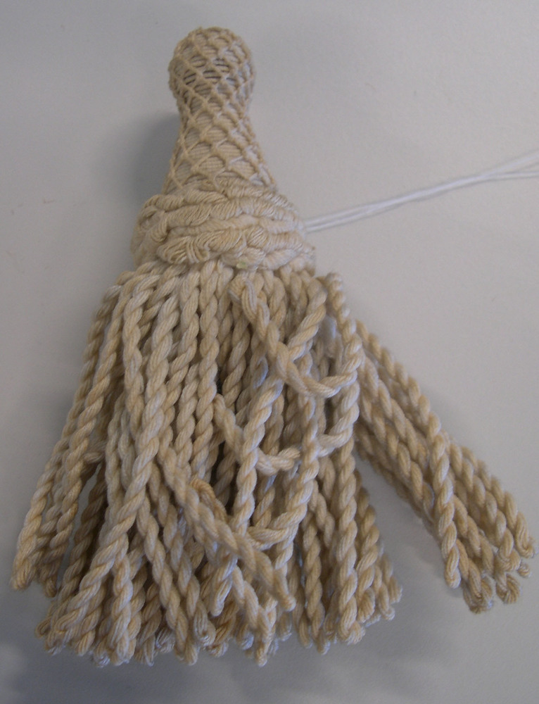Witten katoenen kwast voor een gordijn, geknoopt op de houten knop, de franjes zijn gedraaid.- Trefwoorden
