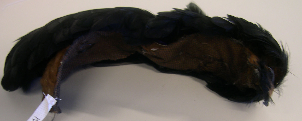 Haarband met zwart veren, gehecht op bruine vezels met tule en metaaldraad.- Trefwoorden