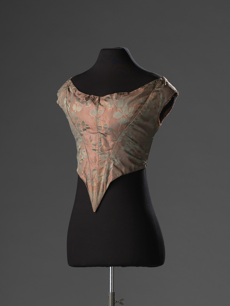 Gebaleineerd mouwloos japonlijfje voor avondjapon, van gebrocheerde changeant zijde in groen en roze met een patroon van blaadjes en takjes. Sluit van voren met veter. In taille voor en achter in punt uitlopend. Voering van wit katoen. De mouwen zijn eruit gehaald en bevinden zich niet in de collectie. Wanneer de mouwen zijn verwijderd is onbekend. Mogelijk werden de mouwen afgewisseld.