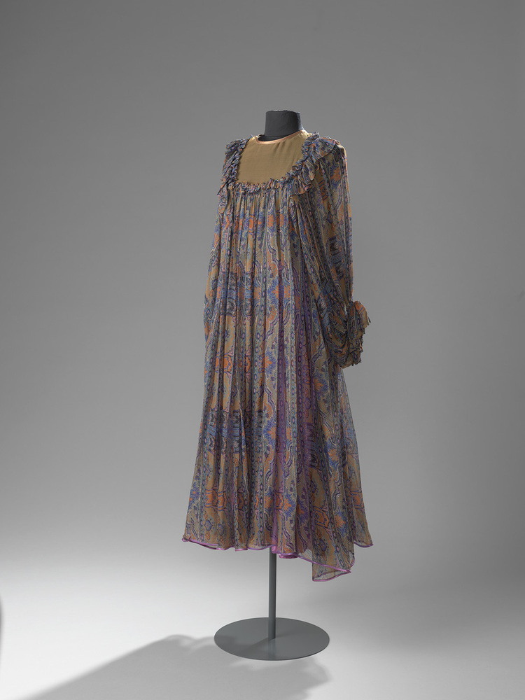 Zijden japon met paarse geplisseerde rok. De japon van bedrukte voile heeft een geel voile bovenstuk, met lange wijde mouwen die bij de uiteinden nauw zijn. Onder japon wordt een paarse geplisserde kunstzijde rok gedragen.