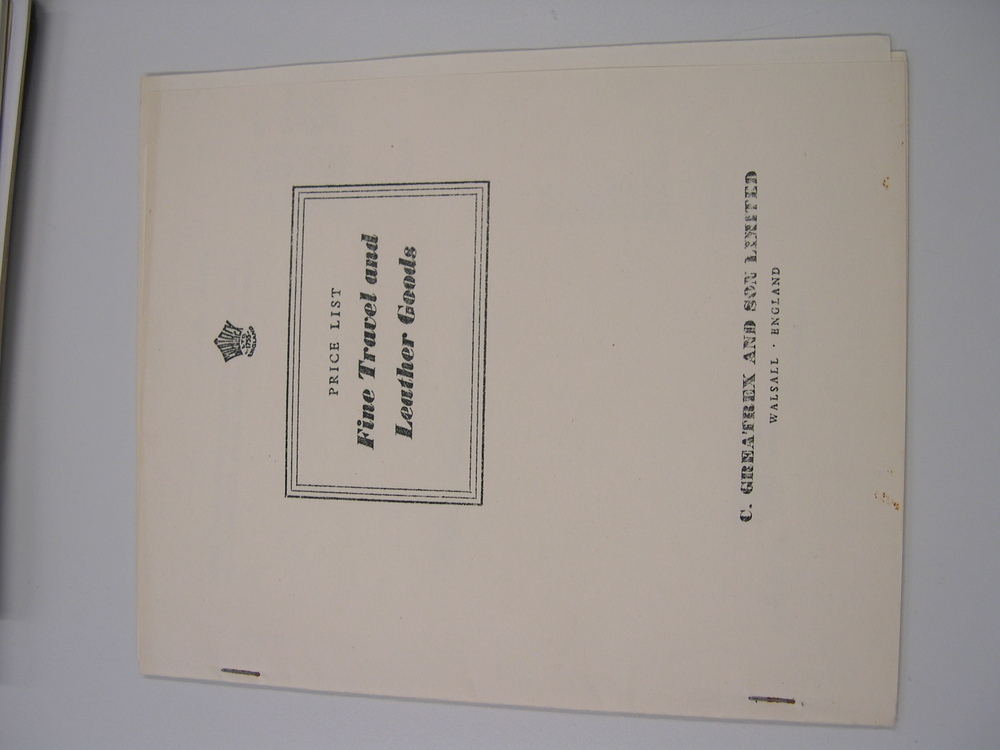 Prijslijst voor reisartikelen van C. Greatrex and son Limited, Walsall - England. Negen pagina's.- Trefwoorden