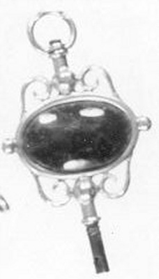 Bewerkte gouden horlogesleutel met groene steen (jaspis).- Trefwoorden