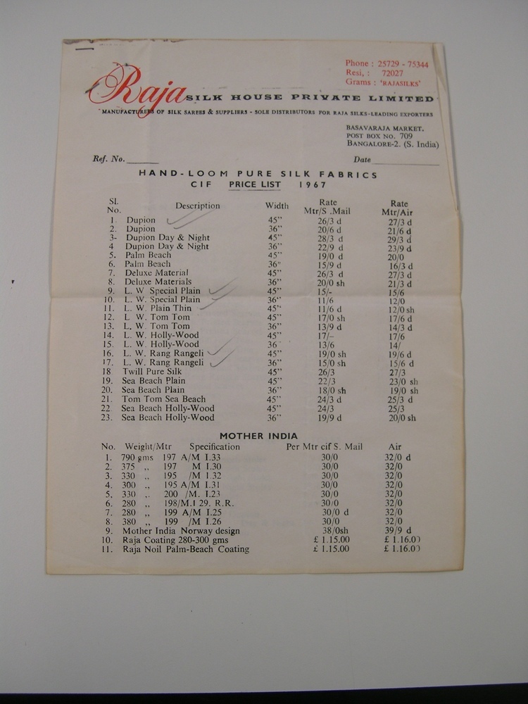Prijslijst Raja Silk House Private Ltd. Twee pagina's, geniet in bovenhoek, zijden stoffen.- Trefwoorden