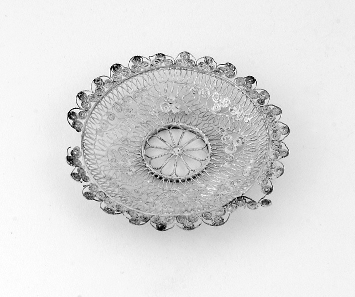 Schotel op lage voetrand, spiegel 10-lobbig en de wand flauwgebogen in filigrain.- Trefwoorden