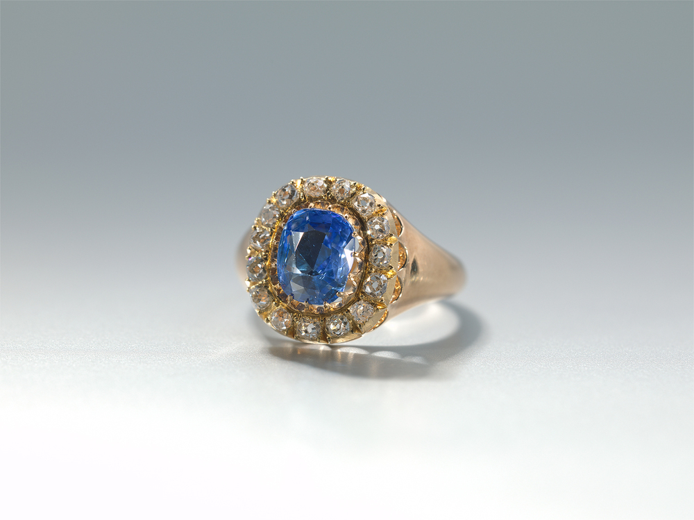 - Ring met een ovaal gesneden saffier omgeven door briljant geslepen diamanten, 1840 - 1860
