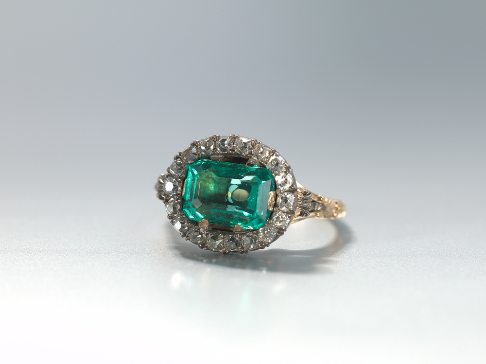 - Ovale ring met een rechthoekig geslepen smaragd (?) omgeven door briljanten, 1870 - 1890