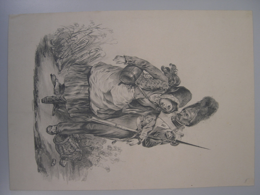 - Tekening van een soldaat die een vrouw helpt, 1750 - 1850