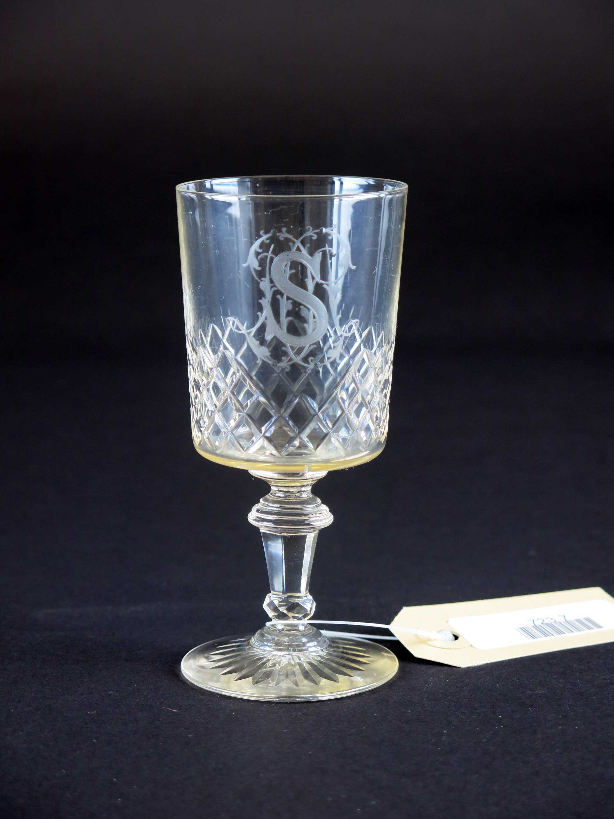 Dit drinkglas komt uit het bezit van de Amsterdamse architect Abraham Salm (1857-1915). Samen met zijn vader Gerlof Bartholomeus Salm (1831-1897) heeft Abraham een grote bijdrage geleverd aan de stedenbouwkundige veranderingen in Amsterdam in de tweede helft van de negentiende eeuw. Waar G.B. Salms naam onlosmakelijk verbonden is met de bouw van Artis in de Plantage, staat zoon Abraham vooral bekend om zijn herenhuizen, stadsvilla’s, (sigaren)fabrieken en paardentramremises, aanvankelijk in classicistische, later in meer historiserende eclectische stijl. Daarnaast ontwierp hij ook interieuronderdelen. Deze 24-delige kristallen drinkset is afkomstig uit het door A. Salm ontworpen huis aan de Weesperzijde 26, waar hij zelf woonde en werkte. Alle onderdelen van de set dragen het monogram ‘S’. ( Sarah Remmerts de Vries)