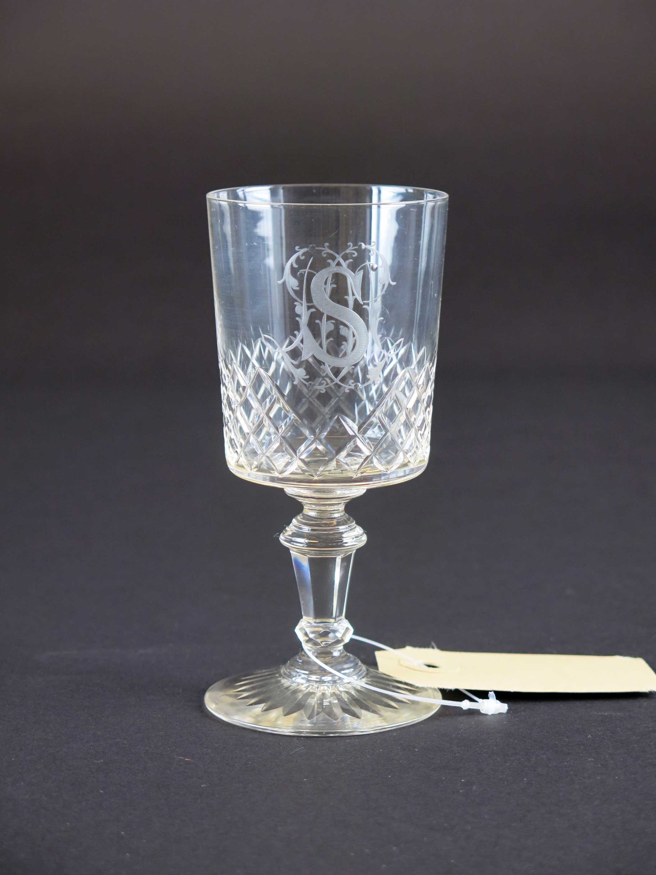 Dit drinkglas komt uit het bezit van de Amsterdamse architect Abraham Salm (1857-1915). Samen met zijn vader Gerlof Bartholomeus Salm (1831-1897) heeft Abraham een grote bijdrage geleverd aan de stedenbouwkundige veranderingen in Amsterdam in de tweede helft van de negentiende eeuw. Waar G.B. Salms naam onlosmakelijk verbonden is met de bouw van Artis in de Plantage, staat zoon Abraham vooral bekend om zijn herenhuizen, stadsvilla’s, (sigaren)fabrieken en paardentramremises, aanvankelijk in classicistische, later in meer historiserende eclectische stijl. Daarnaast ontwierp hij ook interieuronderdelen. Deze 24-delige kristallen drinkset is afkomstig uit het door A. Salm ontworpen huis aan de Weesperzijde 26, waar hij zelf woonde en werkte. Alle onderdelen van de set dragen het monogram ‘S’. ( Sarah Remmerts de Vries)