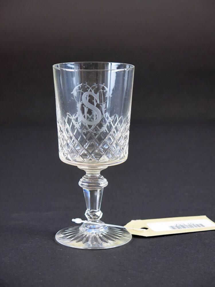Dit drinkglas komt uit het bezit van de Amsterdamse architect Abraham Salm (1857-1915). Samen met zijn vader Gerlof Bartholomeus Salm (1831-1897) heeft Abraham een grote bijdrage geleverd aan de stedenbouwkundige veranderingen in Amsterdam in de tweede helft van de negentiende eeuw. Waar G.B. Salms naam onlosmakelijk verbonden is met de bouw van Artis in de Plantage, staat zoon Abraham vooral bekend om zijn herenhuizen, stadsvilla’s, (sigaren)fabrieken en paardentramremises, aanvankelijk in classicistische, later in meer historiserende eclectische stijl. Daarnaast ontwierp hij ook interieuronderdelen. Deze 24-delige kristallen drinkset is afkomstig uit het door A. Salm ontworpen huis aan de Weesperzijde 26, waar hij zelf woonde en werkte. Alle onderdelen van de set dragen het monogram ‘S’. ( Sarah Remmerts de Vries)