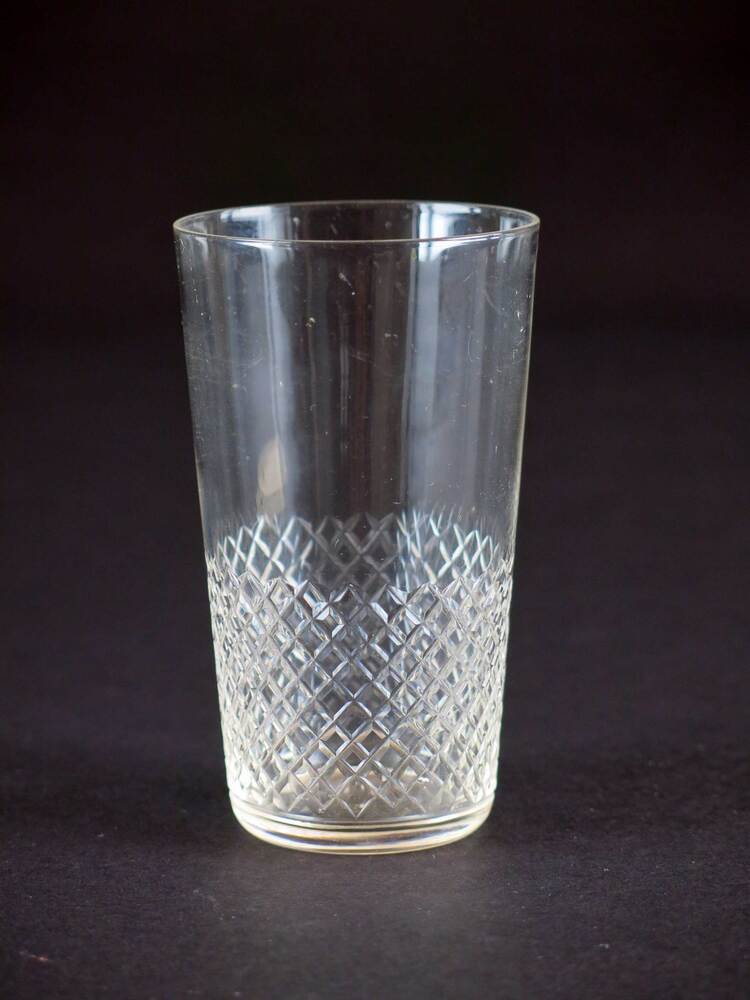 Dit drinkglas komt uit het bezit van de Amsterdamse architect Abraham Salm (1857-1915). Samen met zijn vader Gerlof Bartholomeus Salm (1831-1897) heeft Abraham een grote bijdrage geleverd aan de stedenbouwkundige veranderingen in Amsterdam in de tweede helft van de negentiende eeuw. Waar G.B. Salms naam onlosmakelijk verbonden is met de bouw van Artis in de Plantage, staat zoon Abraham vooral bekend om zijn herenhuizen, stadsvilla’s, (sigaren)fabrieken en paardentramremises, aanvankelijk in classicistische, later in meer historiserende eclectische stijl. Daarnaast ontwierp hij ook interieuronderdelen. Deze 24-delige kristallen drinkset is afkomstig uit het door A. Salm ontworpen huis aan de Weesperzijde 26, waar hij zelf woonde en werkte. Alle onderdelen van de set dragen het monogram ‘S’. ( Sarah Remmerts de Vries)