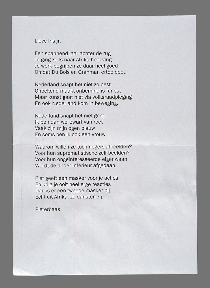 Ferdinand verwees met zijn masker naar het debat over het uiterlijk van Zwarte Piet. Het gedicht is gericht aan ‘Iris jr.’ oftewel Iris Kensmil, die veel kunstwerken gemaakt heeft over de geschiedenis en emancipatie van de zwarte mens. Het Sinterklaasgedicht refereert aan haar werk, zoals haar reizen naar Afrika en inspiratiebronnen, zoals Du Bois ("W. E. B." Du Bois – Amerikaanse socioloog en mensenrechten-activist) en Granman (een leider van de Marrons – weggevluchte slaven). In de voorlaatste strofe hekelt ‘Pieterbaas’ het inferieur afbeelden van ‘negers’ en de ‘suprematistische zelfbeelden’ en ‘ongeïnteresseerde eigenwaan van de mensen die zich daaraan schuldig maken.