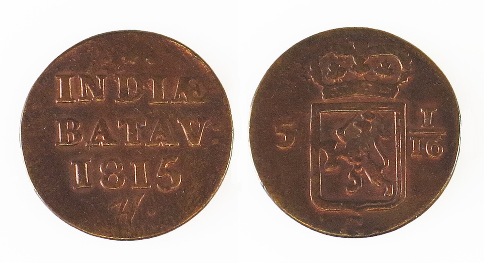 Deze koperen munt uit 1815 heeft de waarde van één duit (eenzestiende van een stuiver). De munt is afkomstig uit Nederlands-Indië en is uitgegeven onder de regering van koning Willem I (1815-1840). Op de voorzijde is het gekroonde rijkswapen met de Nederlandse leeuw afgebeeld, evenals de waarde van de munt. De keerzijde toont de tekst INDIAE BATAV: 1815 H. 'Batav' is een afkorting voor Batavia, destijds de hoofdstad van Nederlands-Indië. De 'H.' onderaan is het meesterteken van vervaardiger Hendrik de Heus. ( Sarah Remmerts de Vries)