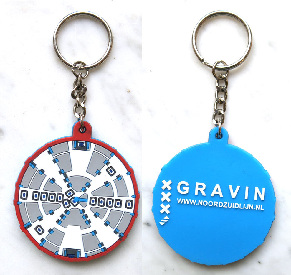 Deze sleutelhanger is gemaakt als aandenken aan de tunnelboor Gravin, die gebruikt is voor het graven van metrotunnels voor de Noord/Zuidlijn. In 2002 nam de Gemeente Amsterdam het definitieve besluit tot de aanleg van de Noord/Zuidlijn, een metrolijn die het mogelijk maakt binnen zestien minuten van het Buikslotermeerplein naar Station Zuid te reizen. De lijn zal straks een geschat aantal van 121.000 passagiers per dag vervoeren. De sleutelhanger is onderdeel van een set van twee. Beide sleutelhangers kennen min of meer dezelfde voorzijde, maar dan uitgevoerd in andere kleuren. Op de achterzijde is te lezen dat de rode sleutelhanger bij tunnelboor Noortje hoort en de blauwe bij tunnelboor Gravin. ( Sarah Remmerts de Vries)