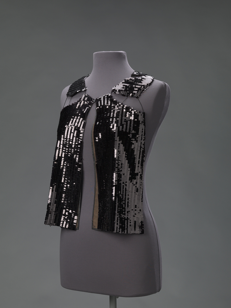 Kraag met bef. Kraag bestaat uit drie losse onderdelen. Bef uit twee onderdelen. Verbonden met draden. Materiaal machinale pailletten op tricot gaas. Gevoerd met kunstzijde?- Trefwoorden