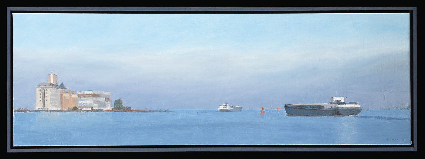 De Silodam is een modern appartementencomplex gebouwd op een strekdam tussen de Houthavens en het IJ. Het gebouw staat ongeveer twee kilometer ten westen van het Centraal Station in het Westelijk Havengebied. Negen etages bieden ruimte aan meer dan zes verschillende typen woningen, evenals bedrijfsruimtes en parkeerplaatsen. Het gehele complex is ontworpen door architectenbureau MVRDV, dat ook verantwoordelijk was voor de toevoeging van het kleurrijke Cancer Center aan het VU Medisch Centrum. Op dit schilderij is de Silodam aan de linkerzijde te zien. Rechts varen twee schepen op het kalme water van het IJ. Twee oranje boeien leveren een verassend contrast op het met de helderblauwe kleur van het water. Kunstschilder Gineke Zikken staat bekend om haar rustige, vereenvoudigde landschappen en stadsgezichten. ( Sarah Remmerts de Vries)